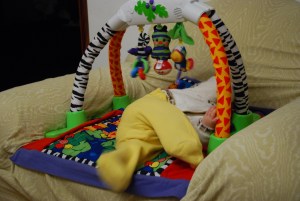 Così ebbi finalmente la brillante idea di usare il suo amato giochino/palestrina, quello con gli animali che vanno su e giù come idioti (che poi son sicura di aver riconosciuto una scimmia ed un pappagallo, ma il terzo animale per me resta ancora un mistero…) e che mia figlia adora bloccare con una mossa di karate, anzichè vederli girare su loro stessi come ossessi. Bene, ho provato a piazzarla sotto questa cosa dai colori psichedelici e HA FUNZIONATO!
