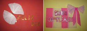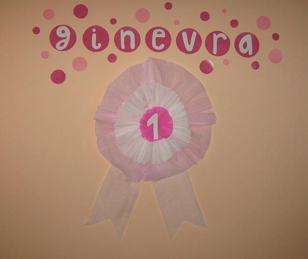 Con il corrospum in varie tonalità di rosa ho ritagliato il nome della festeggiata e con un pò di cartacrespa colorata ho fatto una simpatica coccarda!