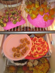 Anche “i piatti” per gli spiedini sono stati “ritoccati” con la carta colorata: ho preso semplicemente delle palle di polistirolo, tagliate in due e ricoperte.