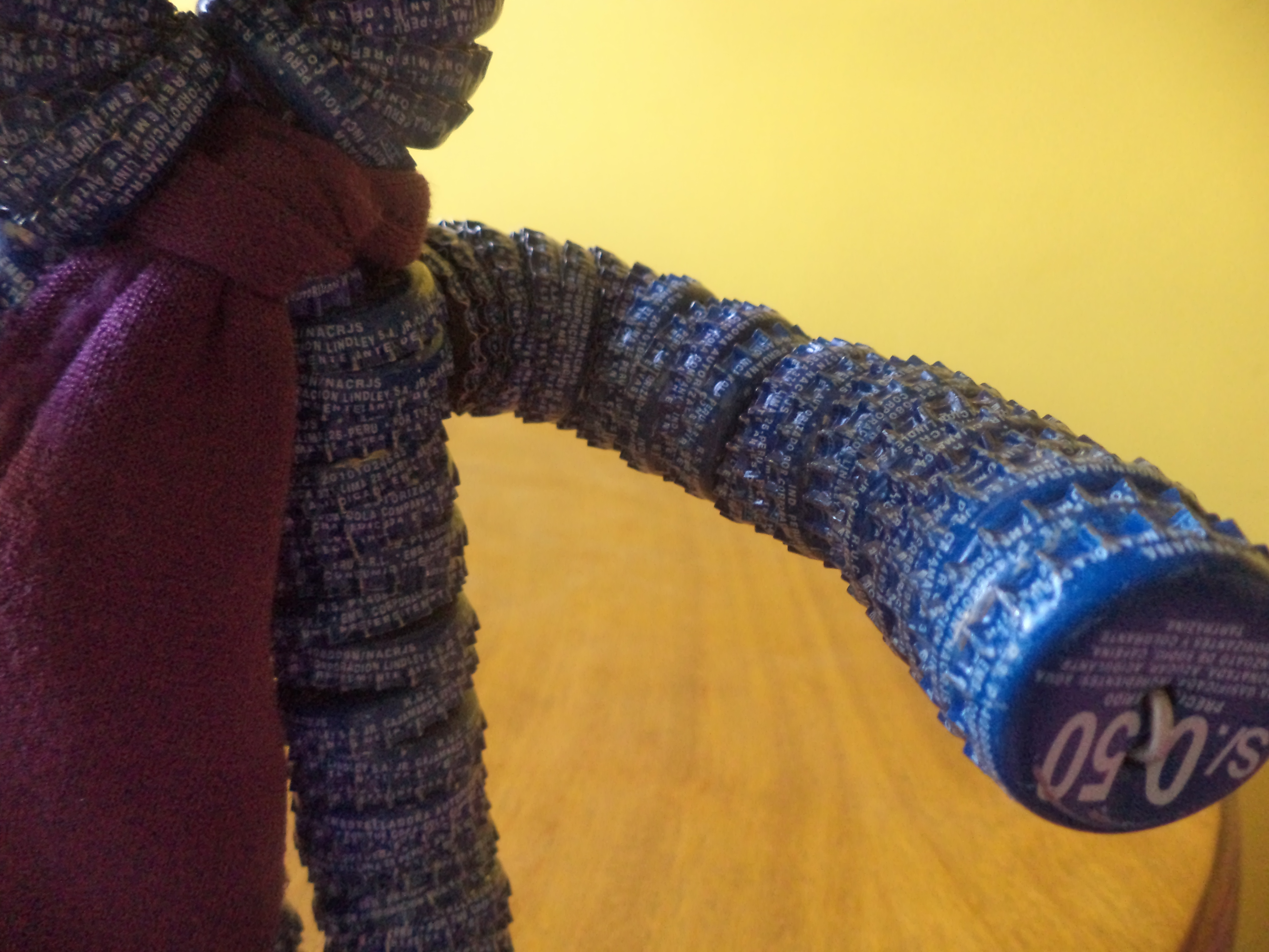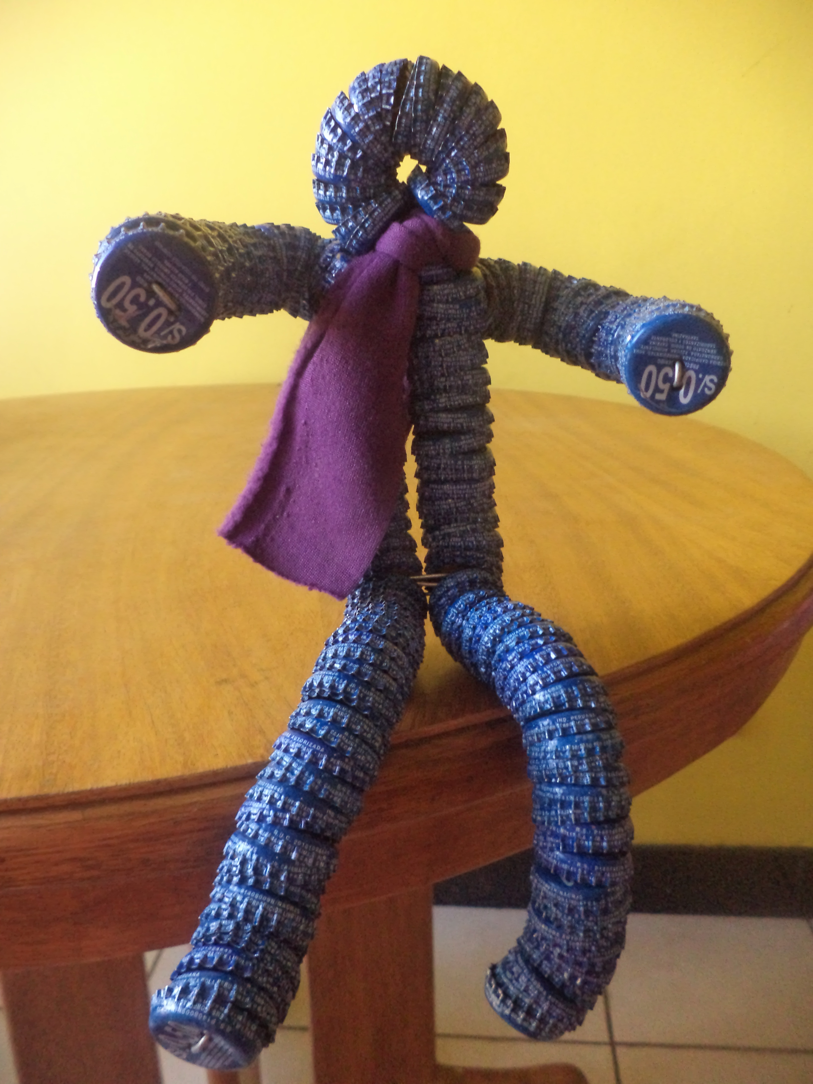 Non oso immaginare quanto tempo ci abbia messo per forare tutti i tappini uno per uno, passarli nel fil di ferro e dargli la forma di un ometto, ma sinceramente mi sembra proprio che sia venuto bene.