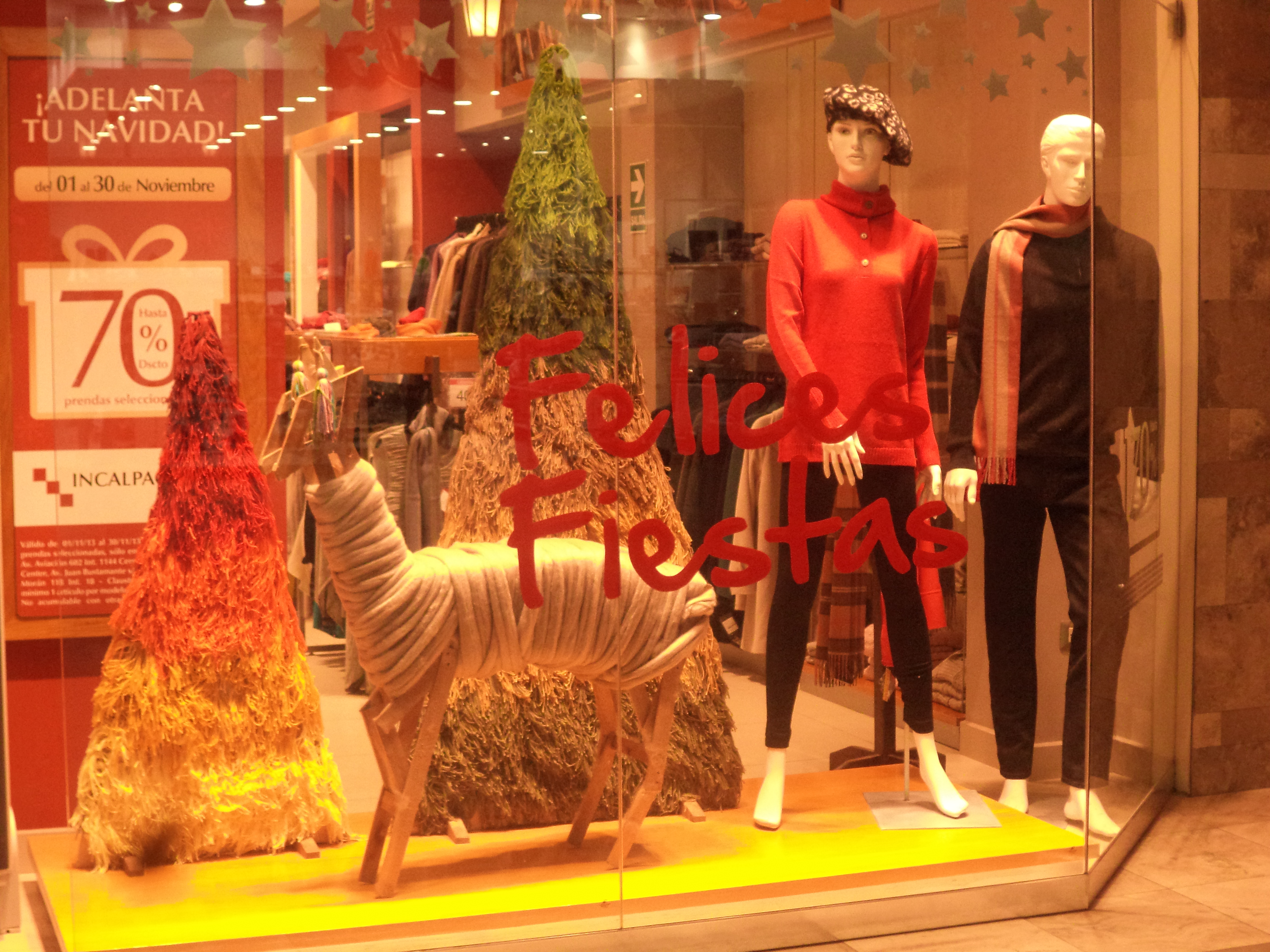Anche le vetrine mi lasciano perplessa perché gli alberi ed i pacchetti regalo a mó di decorazione, campeggiano sotto bikini e magliettine senza maniche. C’é soltanto un negozio che non si discosta troppo da quello a cui sono abituata perché, vendendo soltanto prodotti di lana, porta con sé l’idea dell’inverno comunque e la catena di kuna ha deciso di addobbare le sue vetrine con degli enorme alpaca di legno.