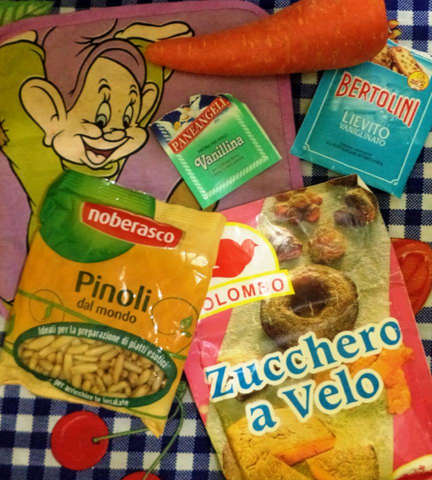 Mentre io gratto con la grattugia grande, lei gratta la sua carotina con la grattugia piccola, e si lamenta perché non ne esce molto, ma almeno mi aiuta, si diverte e facciamo qualcosa di utile e creativo insieme. Perché la ricetta é semplicissima (per scaricarla, clicca qui: TORTA DI CAROTE), ma noi la creativitá ce la mettiamo lo stesso ed alziamo ancora di piú il livello di “italianitá” della torta: giú una bella manciata di pinoli!