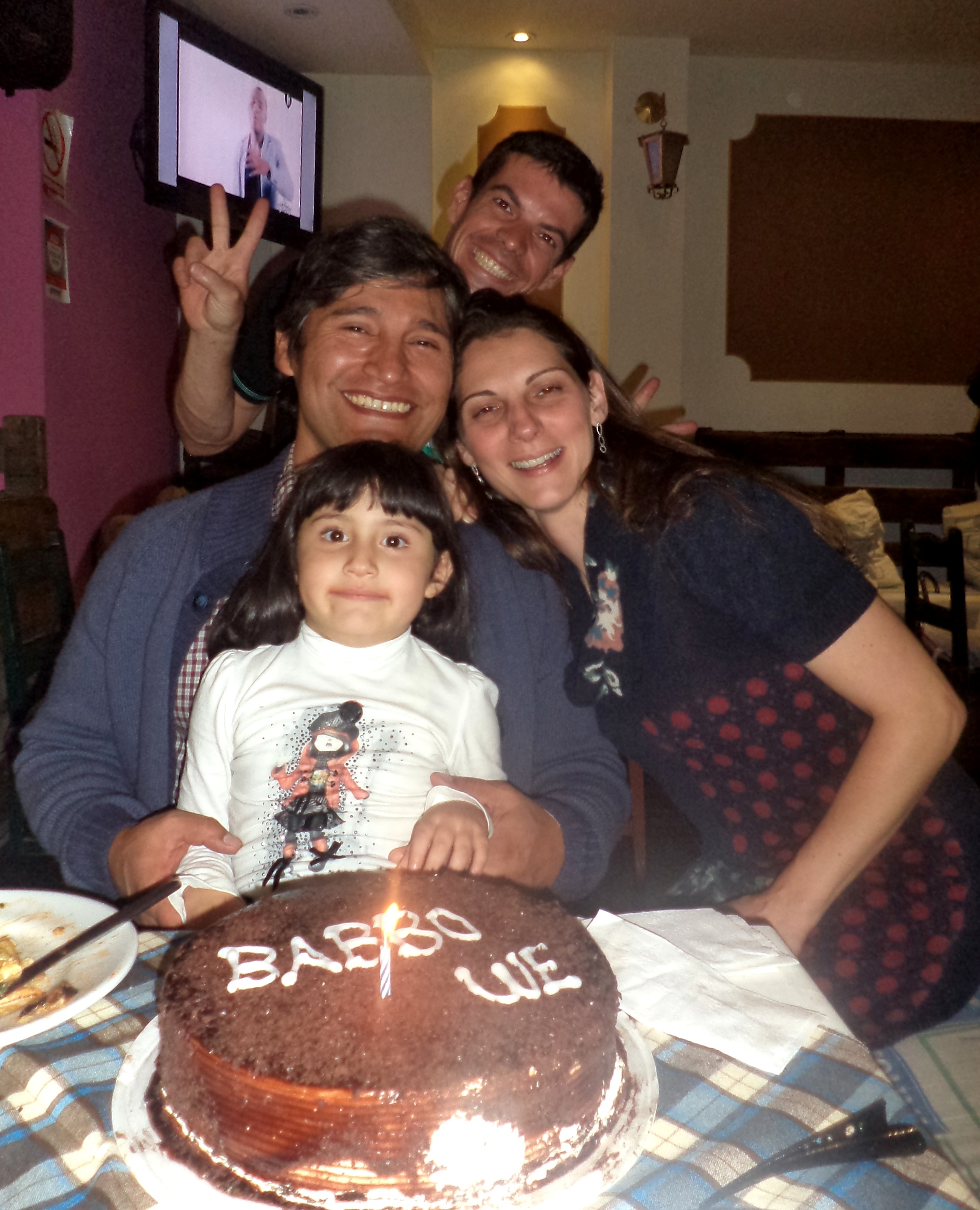 Con una scatola più grande di me in una mano (naturalmente contenente una torta al cioccolato), miss organizzopartyperfetti nell’altra e la candela gigante sulla nostra testa, non c’era modo di preoccuparsi anche della pioggerella che da giorni cadeva incessante sulle nostre teste. E così ci siamo dirette subito verso la pizzeria in cui avevo prenotato un tavolo per una decina di persone che, in perfetto stile latino, non solo non si sono presentate, ma non si sono neppure degnate di avvisare. Ma questo a lei non importava: quando siamo arrivate è stata felicissima di vedere che il nostro amico aveva ascoltato i suoi desideri e tutto il locale era invaso di palloncini gialli; sul tavolo c’erano le candele accese e poi c’era un cartello d’auguri per il suo amato papito che, per fortuna, non poteva capire…e dato che fra gli invitati (presenti!) c’era anche un collega insegnante, potete solo immaginare i commenti a tali sgrammaticati auguri…