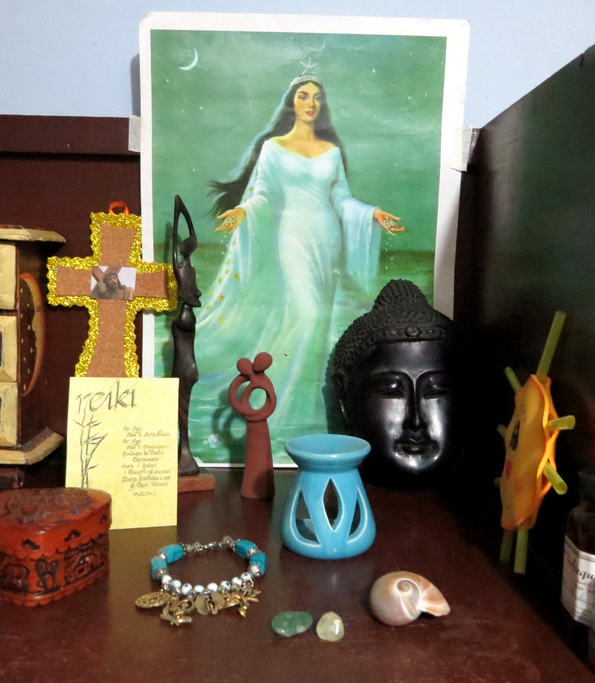 La maschera di Budda appena comprata ad una “vendita di Garage” mi è caduta a pennello: con parole molto semplici le ho cominciato a spiegare come non tutte le persone accettino Gesù nella loro vita ma anche altre figure di uguale importanza, fra cui appunto Budda e molte altre. La mamma, per esempio, saluta e rende omaggio alla signora che sta in quella foto e che si chiama Yemanjà. Allora ci siamo avvicinate al mio altare personale dove, oltre alla Grande Madre Yoruba, c’era anche un’altra statuetta arrivata direttamente dall’Africa che rappresenta sempre la madre e altri oggetti ben più esoterici. Le ho spiegato il perchè di ognuno e alla fine ho deciso di sacrificare l’altare per farne uno collettivo: ho dovuto accettare l’idea di appoggiarvi anche il famoso crocefisso (sig!) e poi un sole di plastica fatto a scuola per non dimenticare che esiste anche Inti, il Dio Sole degli Inca.