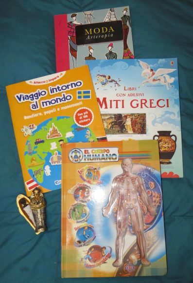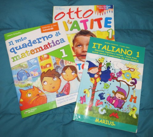 Per fortuna dall’ultimo viaggio in Italia mi ero portata dietro anche tanti libri di prima elementare (gentilmente regalati da maestre e amiche) per insegnare alla mia bambina a leggere, scrivere e fare un po` di matematica basica.