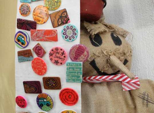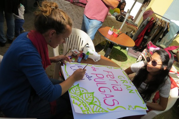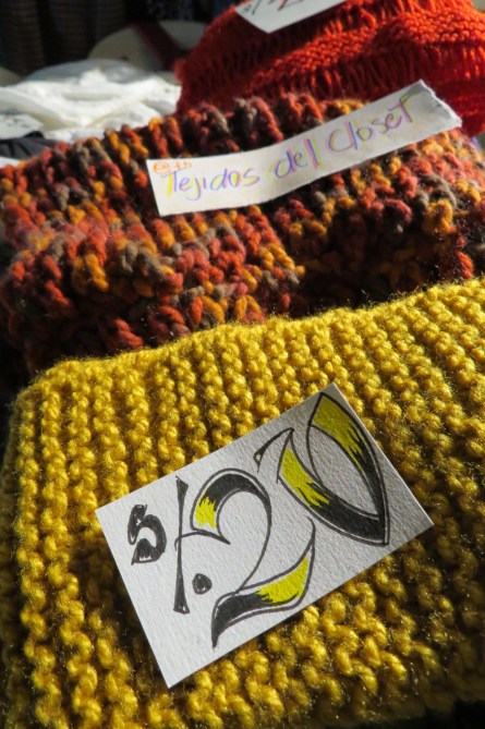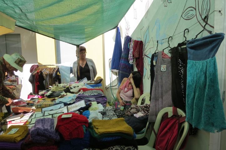 Ricardo è andato a noleggiare i tavoli per esporre le cose di tutti; gli amici del centro in cui lavoro ci hanno prestato i teli da stendere sui tavoli, un mobiletto e gli avanzi delle vetrine passate per decorare.