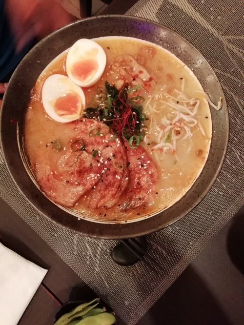 E finalmente eccolo, lui, il vero protagonista della serata: un piattone di Ramen che mio marito, da buon arequipegno, ha scelto ovviamente in versione ultrapiccante e che mi ha riportato di colpo all’infanzia e ai cartoon giapponesi… l’ispettore Zenigata, il ristorante in cui Marrabbio cucinava Okonomiyaki, perfino Doraemon che però amava i Dorayaki… mia figlia lo ha scoperto probabilmente con Kung Fu Panda, ma l’importante è che noi invece