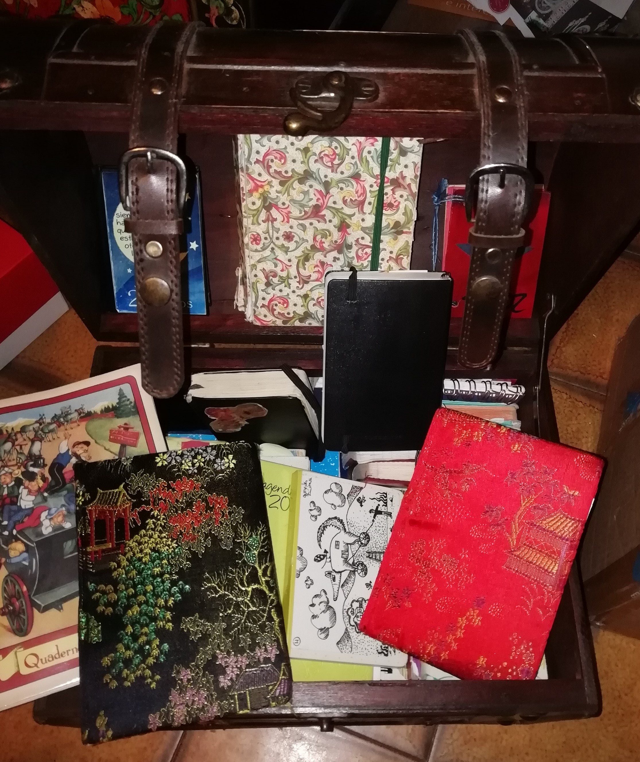 Ma il diario per alcuni (tipo me) è un vizio che non si riesce a smettere. Ed ecco allora che salta fuori un vecchio baule di legno pieno di libretti non più scolastici ma personali. A questo punto il top erano diventate le Moleskine: care eh, ma facevano figo e questo bastava per farne un Must Have. Però i quaderni che più mi commuovono, sono quelli ricoperti di seta cinese che ci regalava Judith Malina. Erano gli unici che usava lei, ne aveva tonnellate e un giorno, mentre stavamo riordinando l’archivio del Living Theatre, quando ne trovammo una scatola piena, di tutti i colori, lei ci disse: “Queste sono per voi. Divitevele e portatele via tutte”. Me ne toccarono due, e non dubito che la ripartizione sia stata fatta equamente perchè tutto, nel Living, era basato sulla equality. Per quello il primo assegno che toccò a ciascun membro della compagnia, dopo l’apertura della prima House a Clinton Street, si aggirava solo sui 10$. Non l’ho mai riscosso, preferivo tenerlo come cimelio e sono sicura che sia qui da qualche parte…