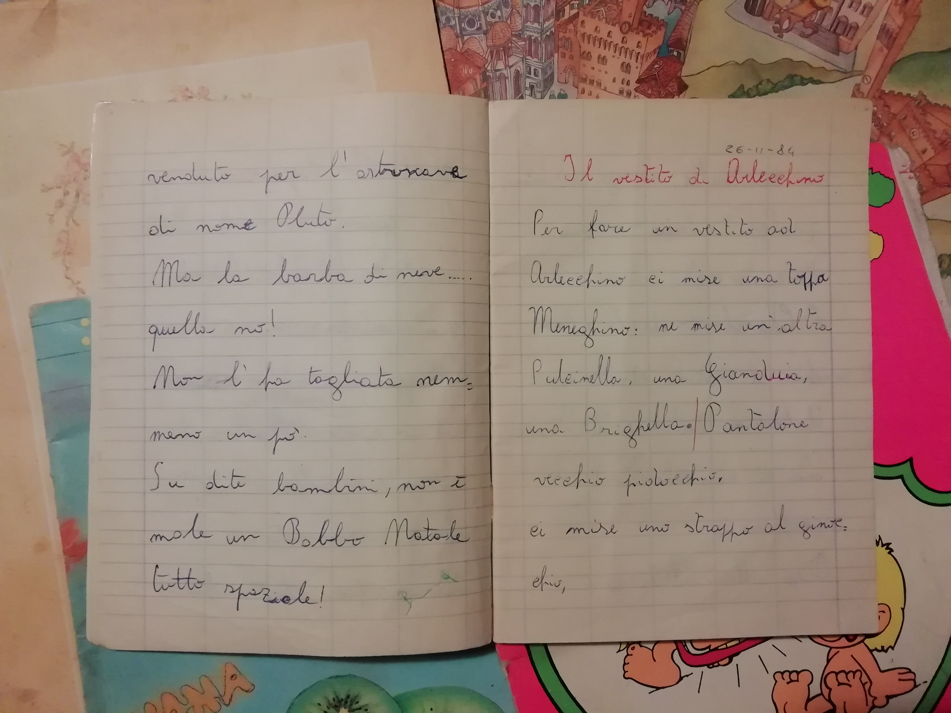 E con i quaderni possiamo andare ancora più indietro perchè ho ritrovato quelli delle elementari, conservati con cura da mia madre per oltre 30 anni. Sfogliare le pagine ingiallite e polverose, mi ha fatto conoscere una parte di me di cui probabilmente non avevo più memoria. Analizzare la mia calligrafia di quando non avevo ancora una calligrafia, ma mi limitavo a rispettare la dimensione delle righe e le improbabili curve comandate del corsivo maiuscolo. Guardare i miei disegni di bambina e scoprire che disegno ancora come allora (che tristezza!)